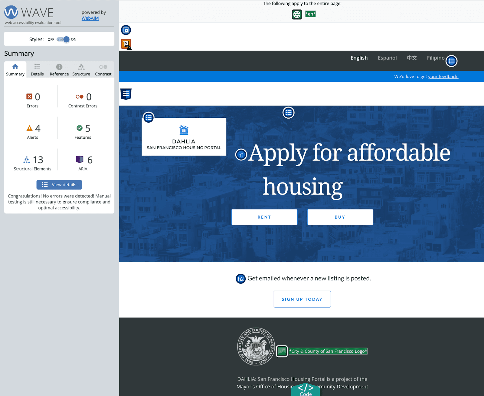 By using a free WAVE accessibility browser extension, we’re able to quickly scan the San Francisco Housing Portal - DAHLIA ( https://housing.sfgov.org/ ) for common accessibility issues, such as poorly formatted front end code and color contrast which can make websites hard for folks with vision impairments to navigate the website. In this example we can see where color contrast might be a problem when we have white text on a dark blue background, and dark blue text on a light blue background.