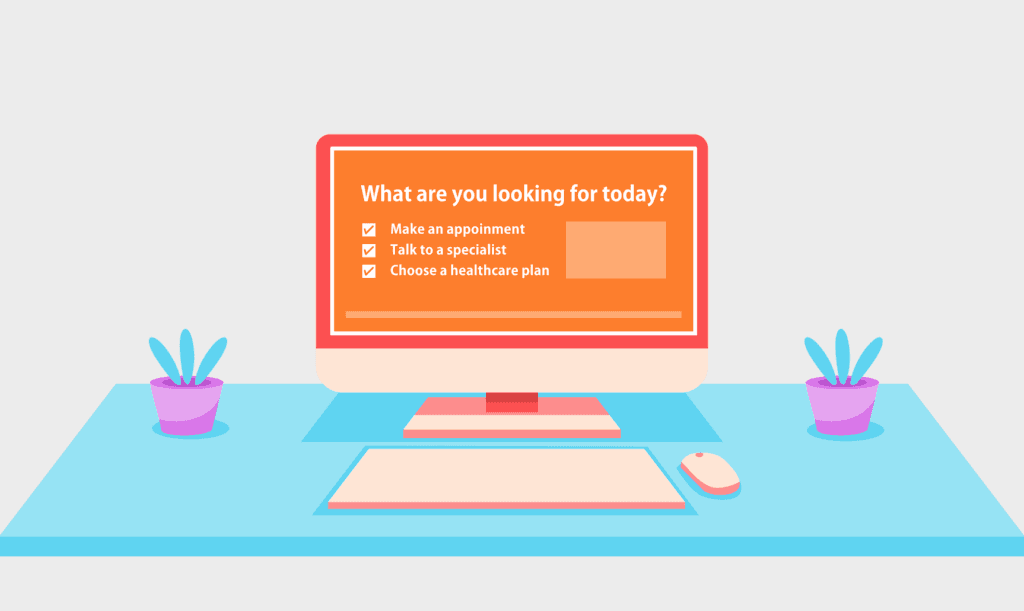 In the example below, we designed a very simple flow for a client on the health insurance sector. The solution is a needs assessment tool, where a “concierge” guides users through some questions to understand their needs and recommend the best types of health insurance for them. We used very simple interactions, lots of icons, and an avatar to give the concierge some personality and humanize the flow a bit.