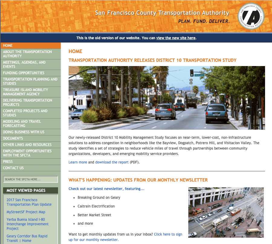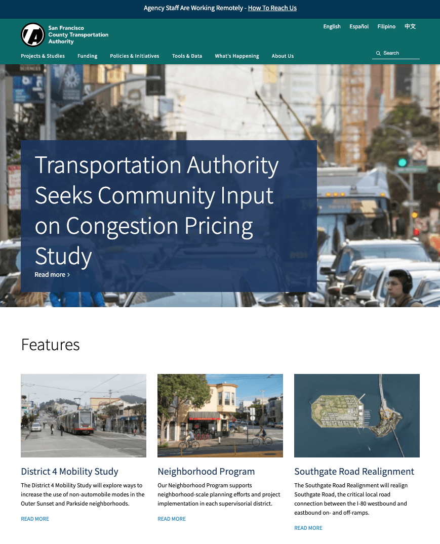 SFCTA has a vast portfolio of projects and studies across a wide range of topics and issues. The previous website was built using a legacy content management system which was cumbersome and unintuitive for non-technical content authors. Visitors to the site include the general public as well as partners, advocates, and transportation insiders. Over the life cycle of the previous website, it became more difficult for authors and administrators to organize such a wide variety of content in a way that was easy for the public and stakeholders to discover and receive updates.