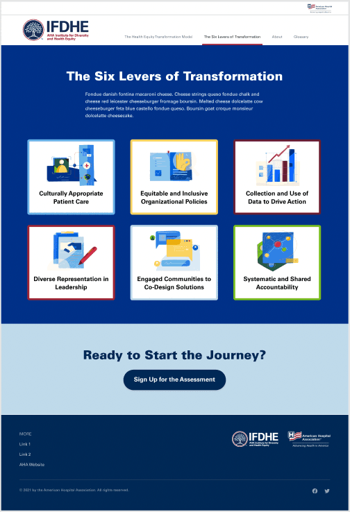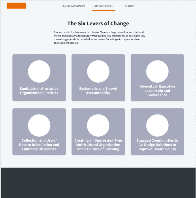 Educational: The site needs to build each visitor’s knowledge of the roadmap’s six equity domains, inspire them to take the Health Equity Assessment, and begin a journey toward actionable steps and impact.