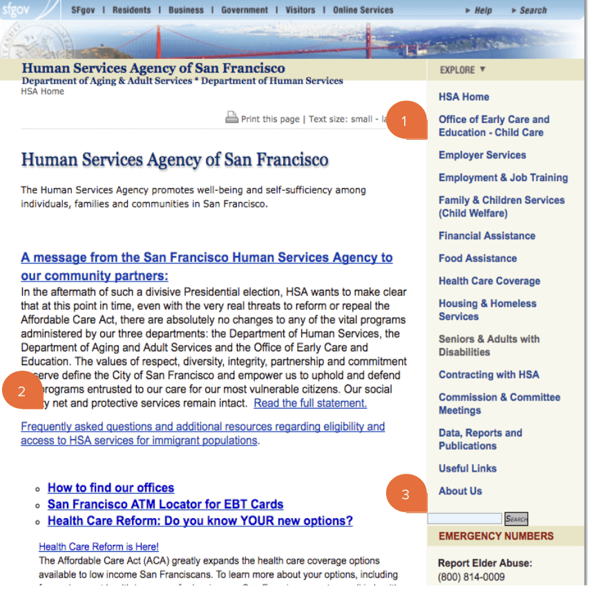 Upon the successful delivery of the report, HSA renewed their partnership with Exygy for a second phase: to implement the recommendations from the report in a massive website redesign, including the migration, editing, combination and removal of over 6000 pages from the old website to a new one. Exygy led a multi-partner team to rebuild and relaunch HSA’s digital client-facing services platform by designing the user experience and visual interface, developing the site frontend and backend content management system (CMS) in Drupal, and leading the content strategy, training, and authoring. The new site launched in 2017 and is the foundational component upon which HSA is now iteratively launching new digital-based services.