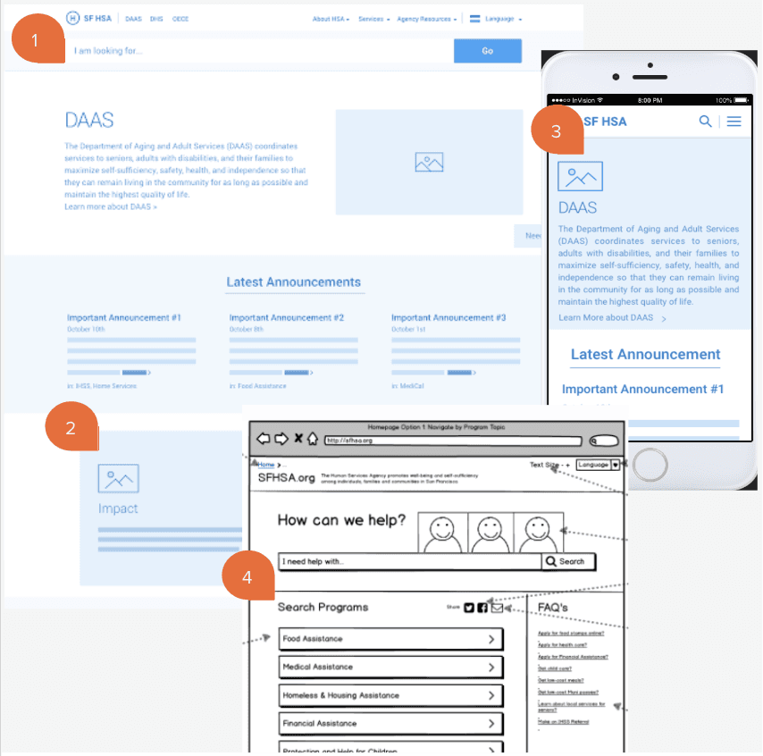 Exygy created wireframes for key HSA pages based on the outcome of user interviews and user flows. The pages represented a new homepage, “lobby” pages that displayed Services and Programs, Search results, and legacy pages that would house content transferred from the old site into the new platform.
