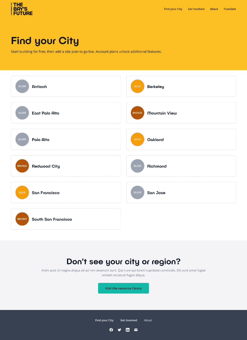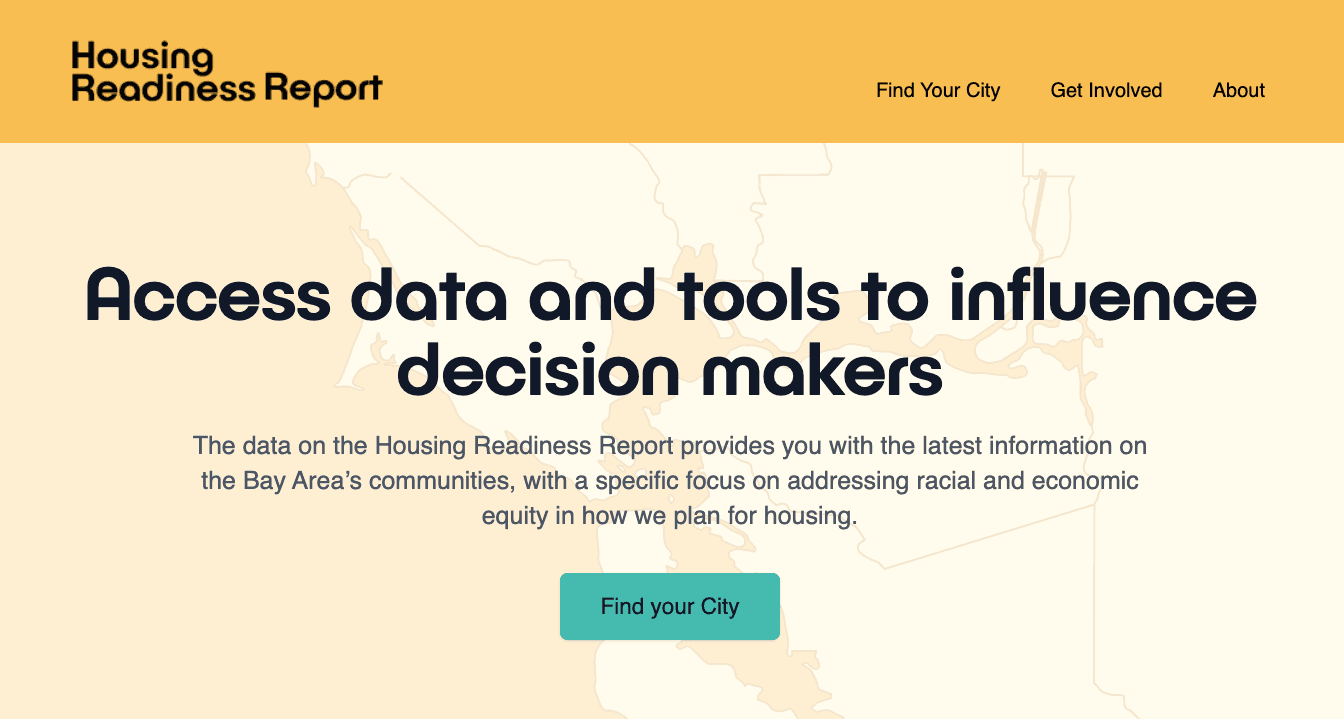 To address growing housing anxiety in the Bay Area, California state officials have called on the region to plan for over 400 thousand new homes in the next decade as part of the Regional Housing Allocation Program (RHNA). To work towards RHNA goals, the Association of Bay Area Governments established local housing mandates for cities, towns, and counties which are divided based on income and affordability levels. To create accountability for jurisdictions to build more housing, PBF needed a way to clearly communicate the impact of the housing crisis on the Bay Area’s most vulnerable communities and how ready each city is to address mounting housing pressures. Exygy partnered with PBF to create that tool.