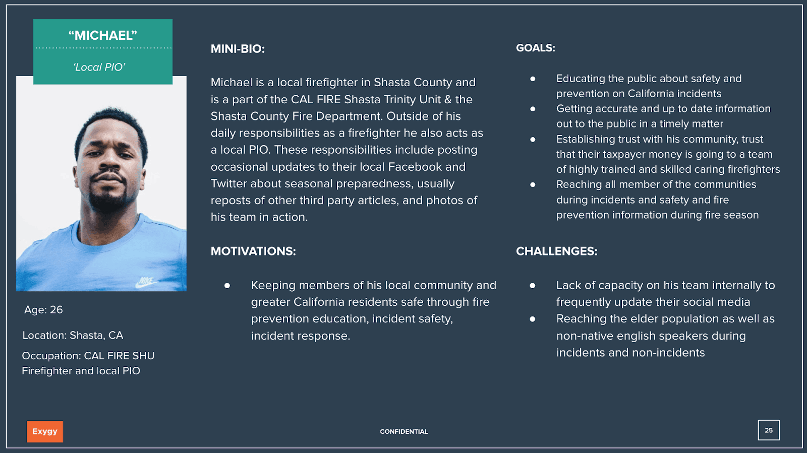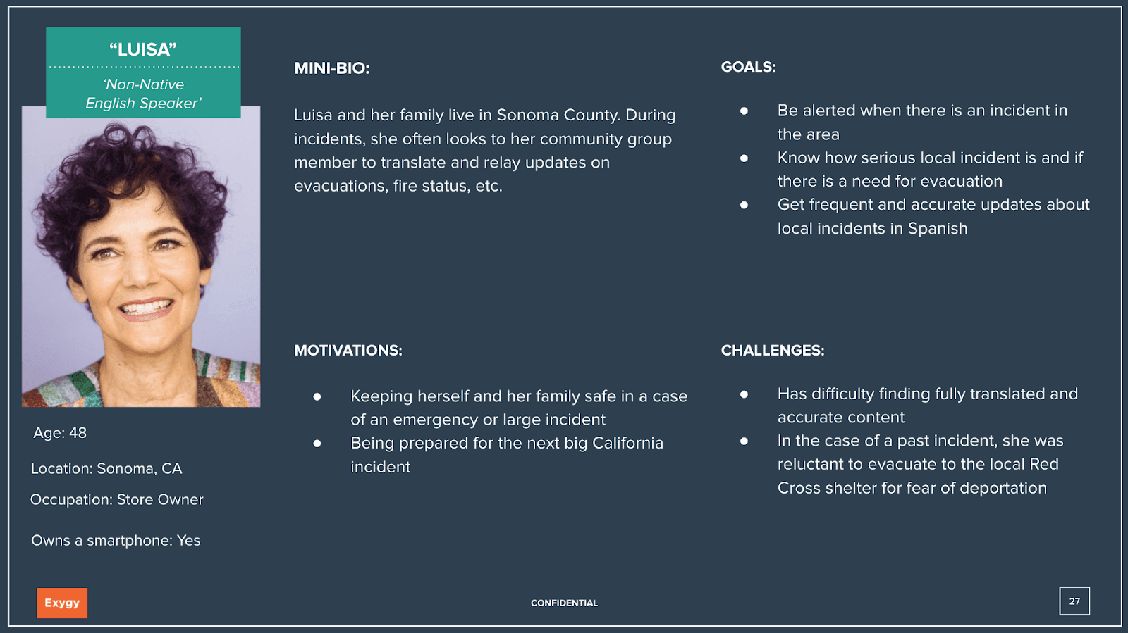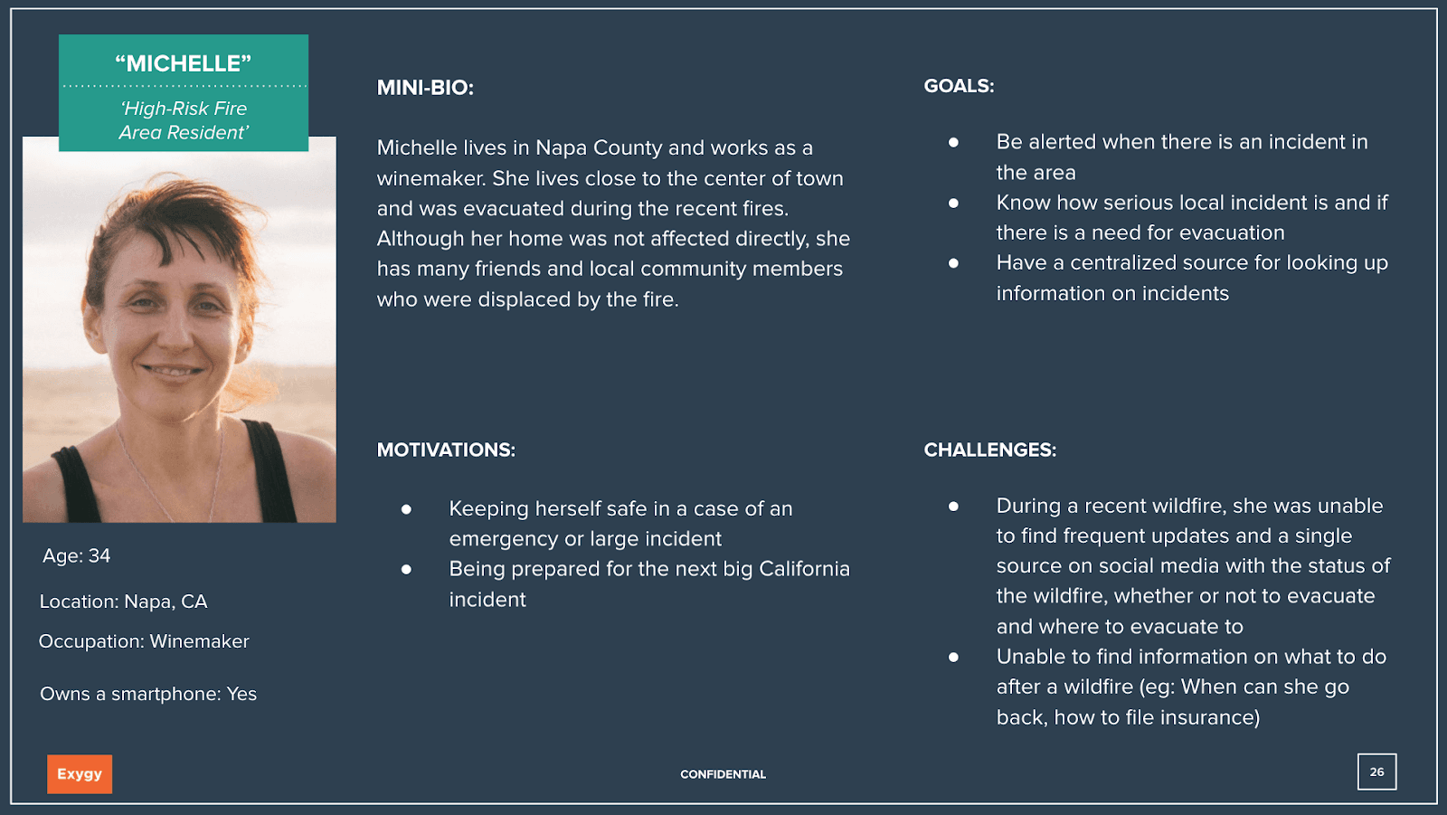 Through these interviews, we learned that there was a need for more guidance on how Californians should prepare for wildfires before the season starts. During wildfire season, many residents use broadcast television, radio, and online platforms such as Facebook, Twitter, and Google for wildfire updates - but the information on these channels is not always validated. Additionally, residents living in remote areas are more frequently dependent on offline communication and information, which is more time-consuming and overall more difficult to access.