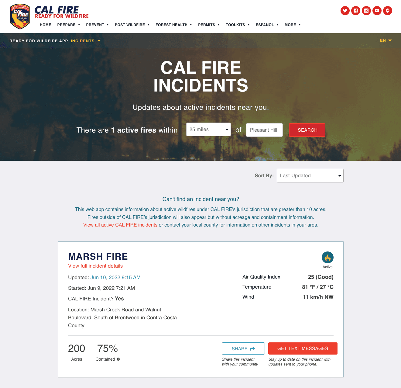 Over 120 days during the 2020 wildfire season, our system has sent over 1.2 million text messages to subscribers — a crucial part of keeping Californians informed about active wildfires in their area. More recently, between February of 2020 and July of 2021, the Incidents app has had 274,000 page views.