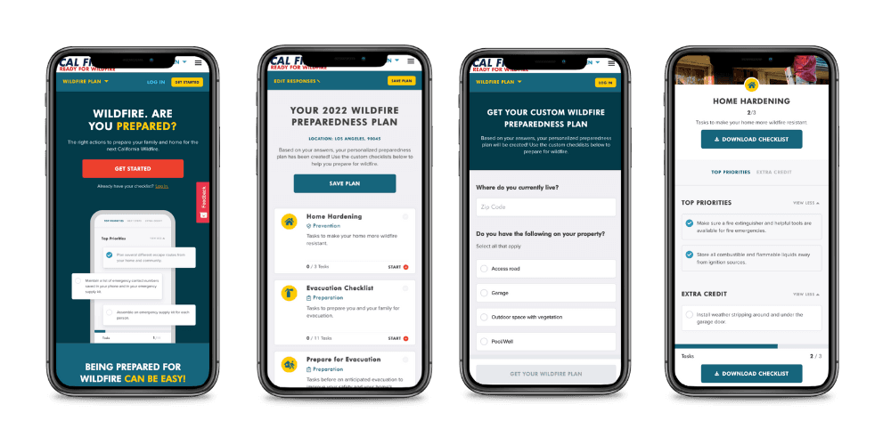 As a digital innovation studio founded in human-centered design principles, we worked to ensure that Ready for Wildfire is as accessible and intuitive for users as possible. Our designers interviewed California residents and emergency responders in areas recently impacted by wildfires (Sonoma, Napa, Paradise, etc.) to understand their needs when preparing for wildfire season and acting during a wildfire incident.