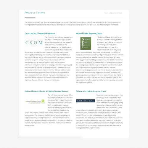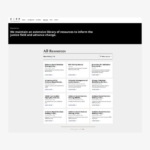 Another new feature we added is the “Resource section.” Over 40 years, CEPP has developed a large library of guides and resources on topics such as pretrial justice, parole and probation and evidence-based decision making — some of it is one-of-a-kind across the nation. The Resources section makes it easier for visitors to access this critical information but gives them the ability to filter through topics.