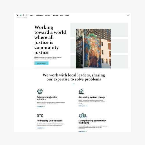 CEPP’s website was outdated and no longer reflected who they were as an organization. It didn’t properly convey the true impact of the difficult and meaningful work that the CEPP team was doing every day. For non-profit organizations, websites serve as the first opportunity to inspire people and other organizations to collaborate. We saw an opportunity to design a modern that answered the question, “Who is CEPP?”. We wanted the CEPP website to tell a strong story: showcase the organization’s unique process to encourage and support the progress of the criminal justice systems, and their reputation and impressive track record after 40 years in this field.