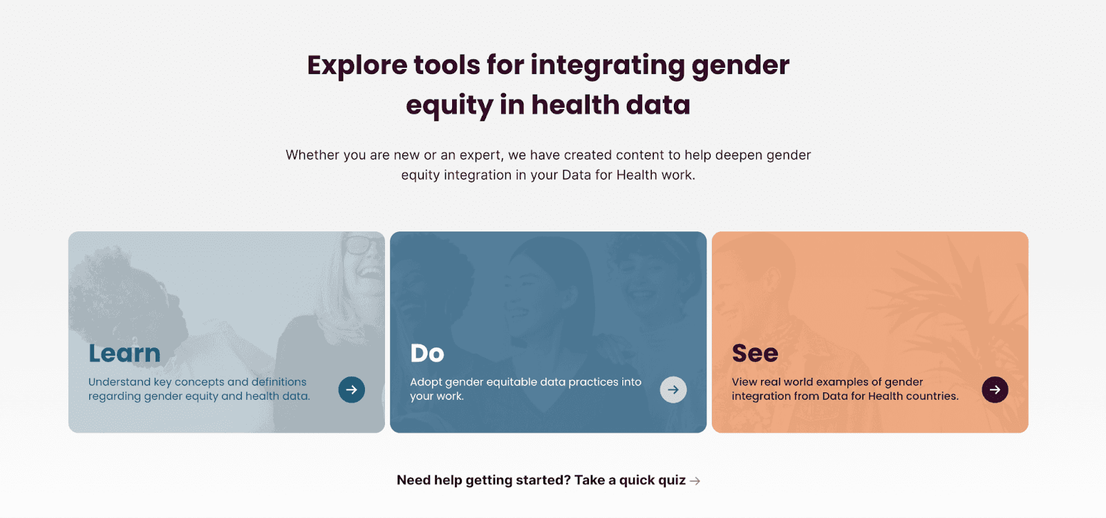 While the Gender Equity Unit team always remained the subject matter experts, we strategized with them on how to best organize their content. We created a three-category system for displaying content; Learn, Do, See. We also build a quiz that assesses an organization’s, individual’s, or country’s commitment to gender equity, with Gender Equity Unit content based on the World Health Organization’s gender assessment scale. The quiz then directs them to resources and links to build community and tools to advocate for gender equity.