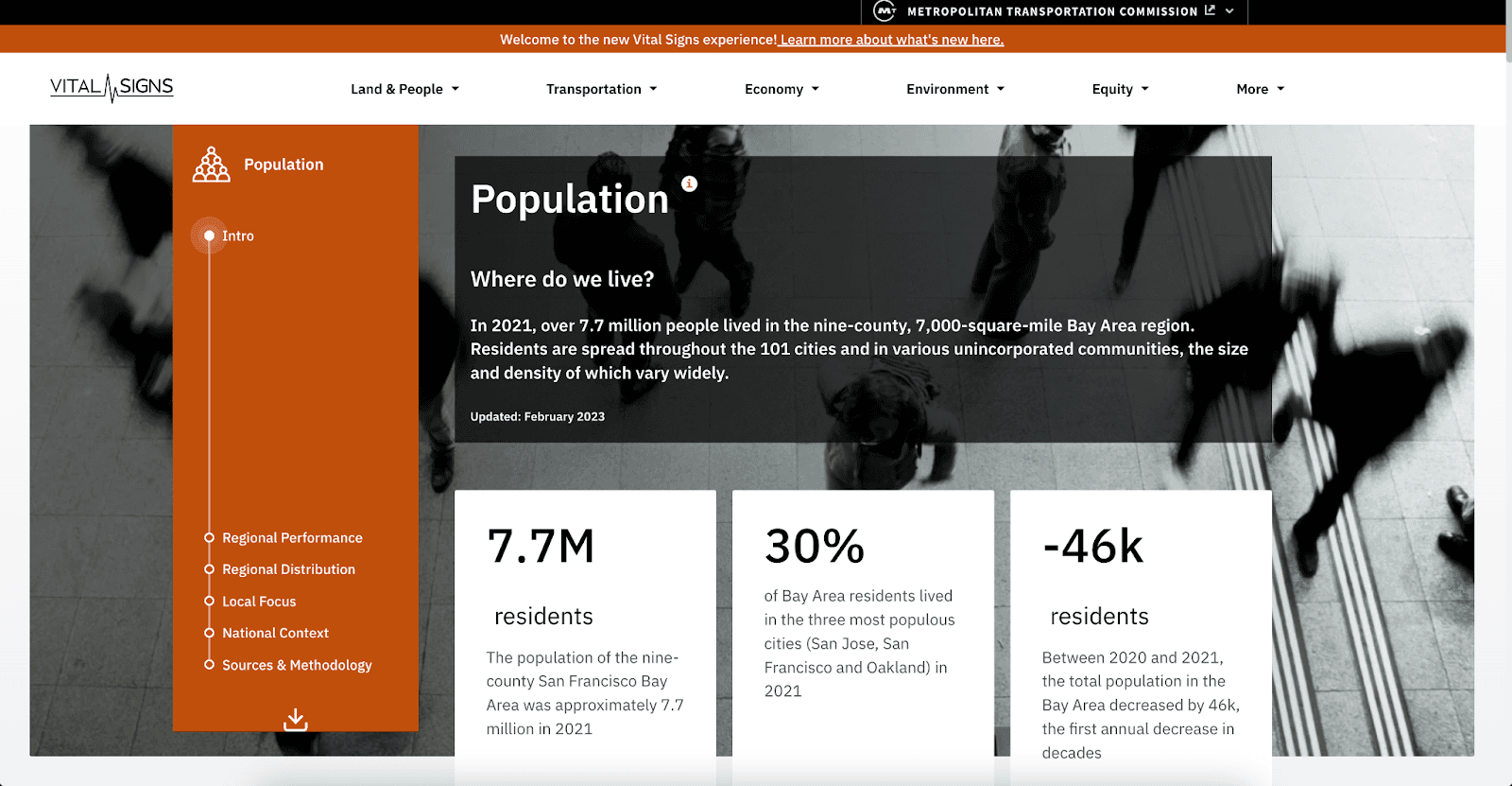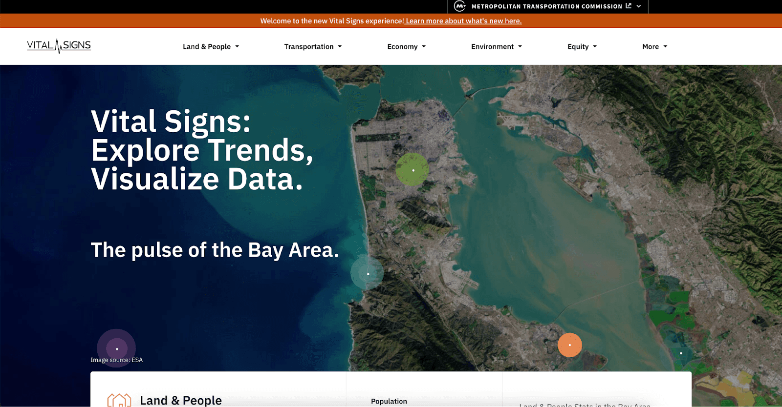 The new Vital Signs website was successfully launched in August of 2023 and is currently serving Bay Area residents. It's a massive step in making environmental and civic indicators available to the public, especially data sets that show the impact of COVID-19. Better access to information about our cities allows us to understand how to shape them to be more equitable for everyone.